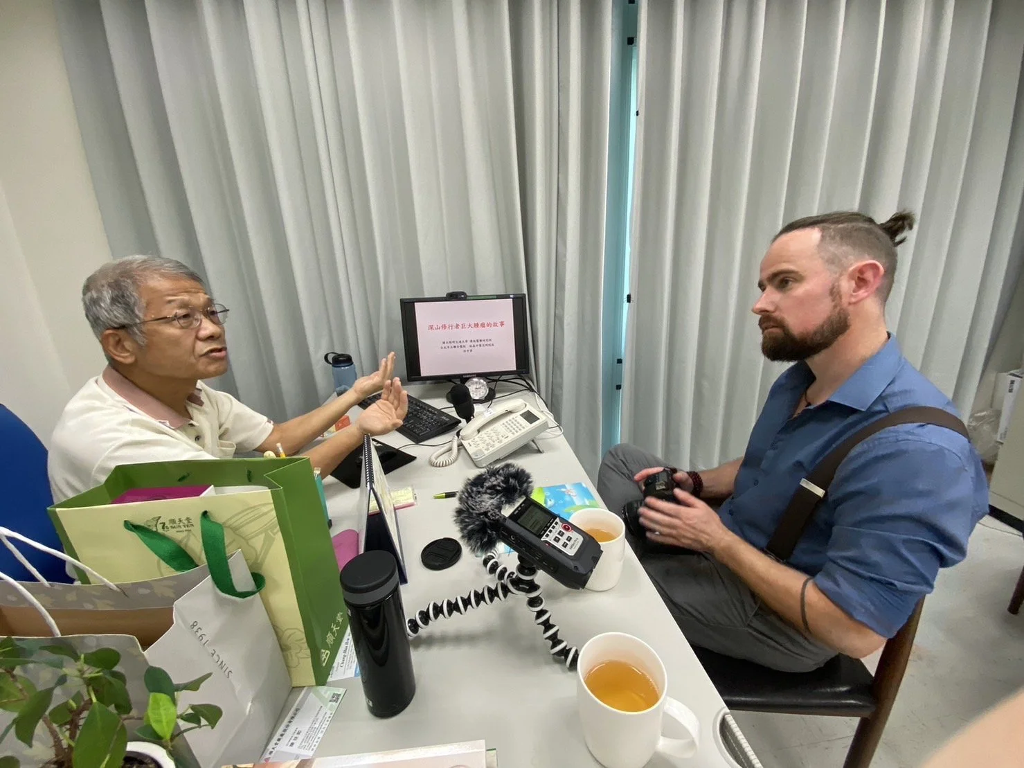 Interviewing Prof. Lin of National Yang Ming Chiao Tung University on herbal medicine research.